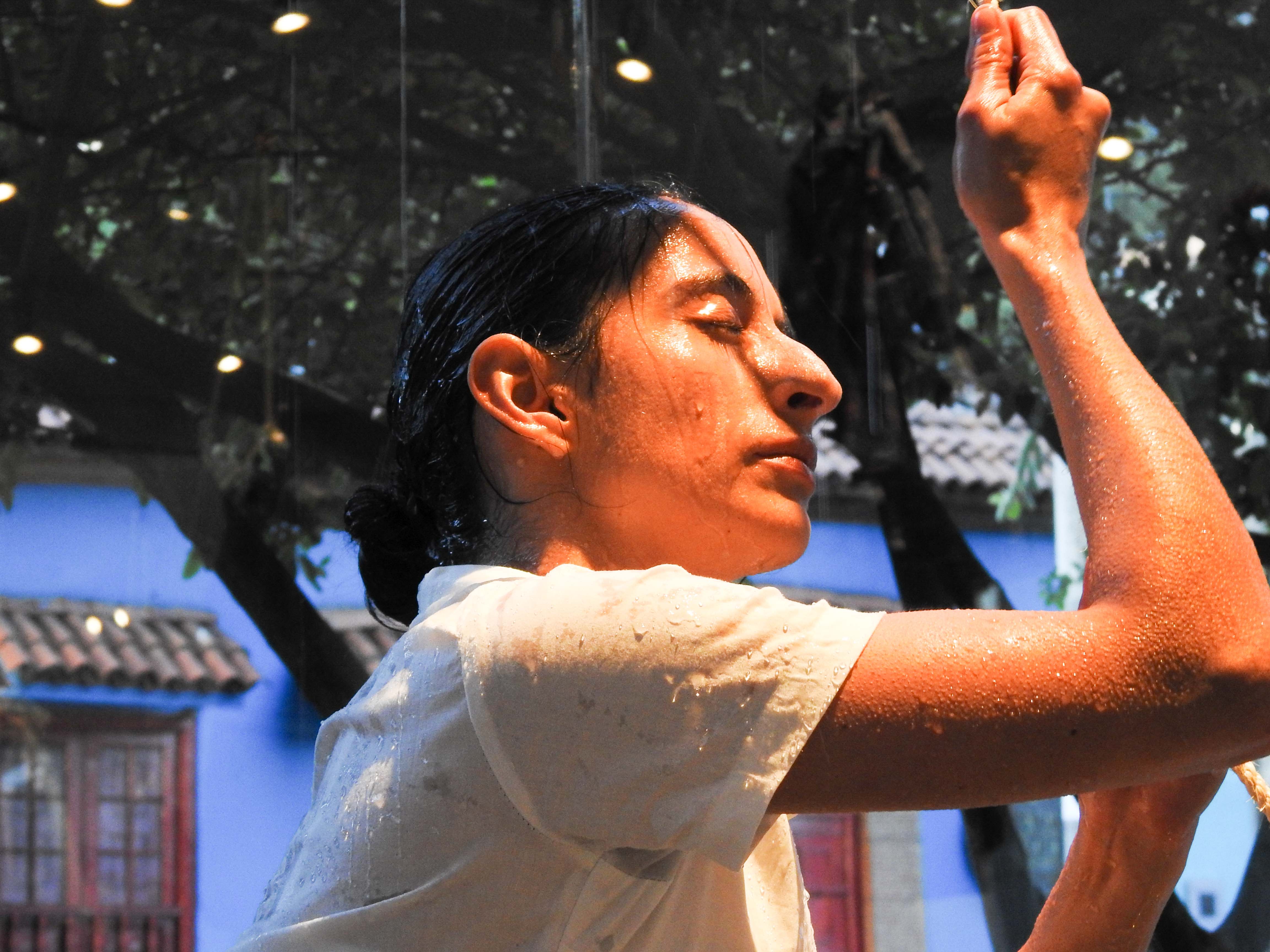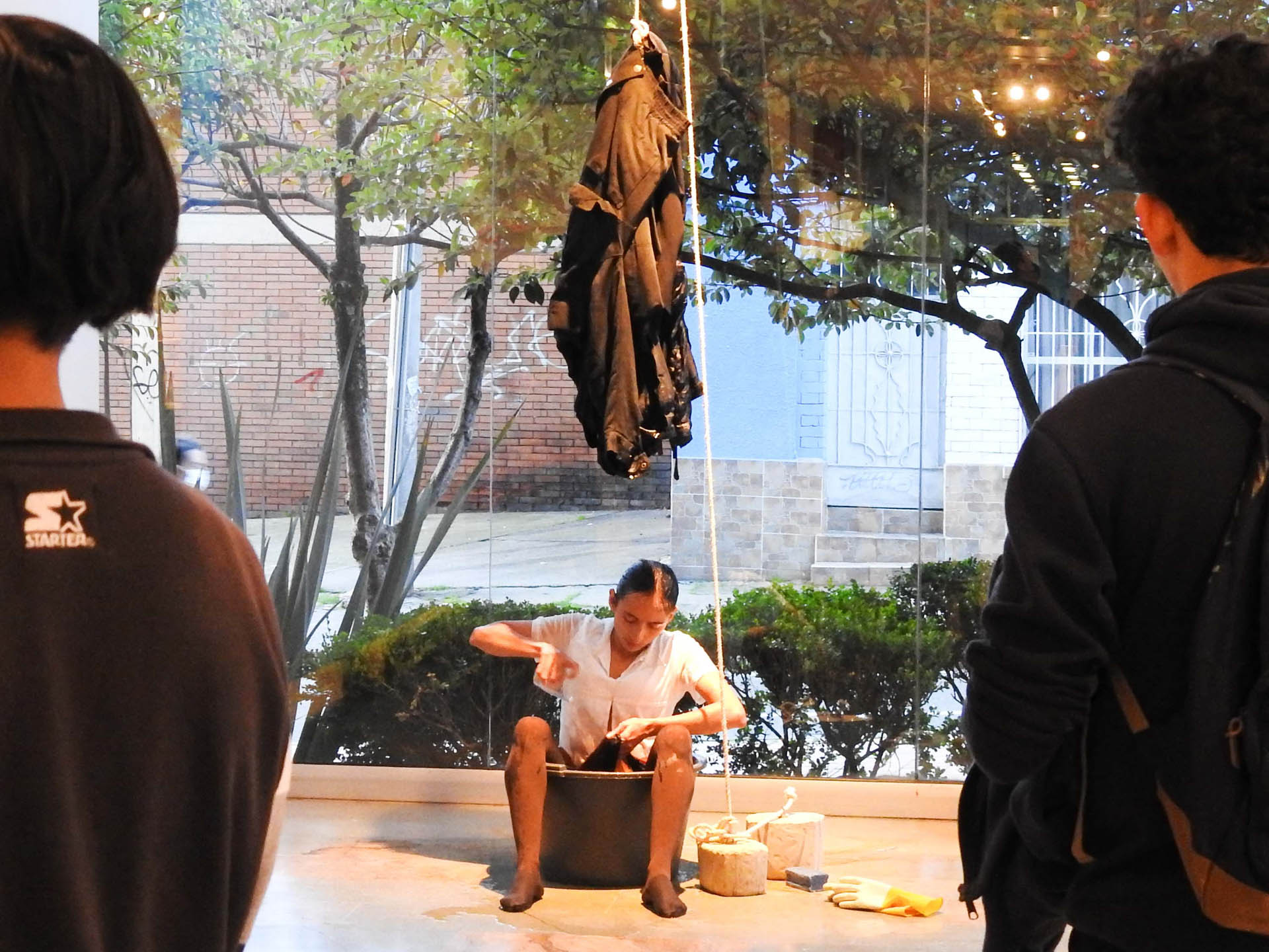Oscilaciones consta de 25 cúmulos de ropa de distintos colores colgada del techo por medio un sistema de poleas y lazos de cabuya sujetados al piso por pesos de cemento; bajo estos cúmulos hay 25 baldes plásticos con agua y jabón. En el fondo de la instalación hay un video en pantalla en el que una mano se funde en una lenta desaparición. Tzitzi Barrantes, (performer) sube y baja cada cúmulo de ropa y sumerge las prendas en el agua, las lava, exprime, restriega y las vuelve a subir. La ropa permanece en un continuo proceso de lavado y sufre el proceso de purificación en el lugar del cuerpo ausente de su portador. En lapsus discontinuos de tiempo, la performer realiza estas labores de forma  casi meditativa, tareas que su cuerpo a lo largo de la vida ha aprendido e interiorizado. Abandona de nuevo esta acción para iniciar con la inmersión de la ropa que ha dejado de gotear donde el tiempo contenido en el agua va develando cada detalle que aquí se desenvuelve. El constante goteo del agua, narra no solo el paso del tiempo contenido en el caer del agua, la ropa narra la historia del cuerpo de la mujer en pos del servicio doméstico. La presencia del cuerpo mecanizado, versus el goteo incesante de la ropa colgada anuncia una espera, un discurrir del tiempo, un tiempo que exige tiempo.