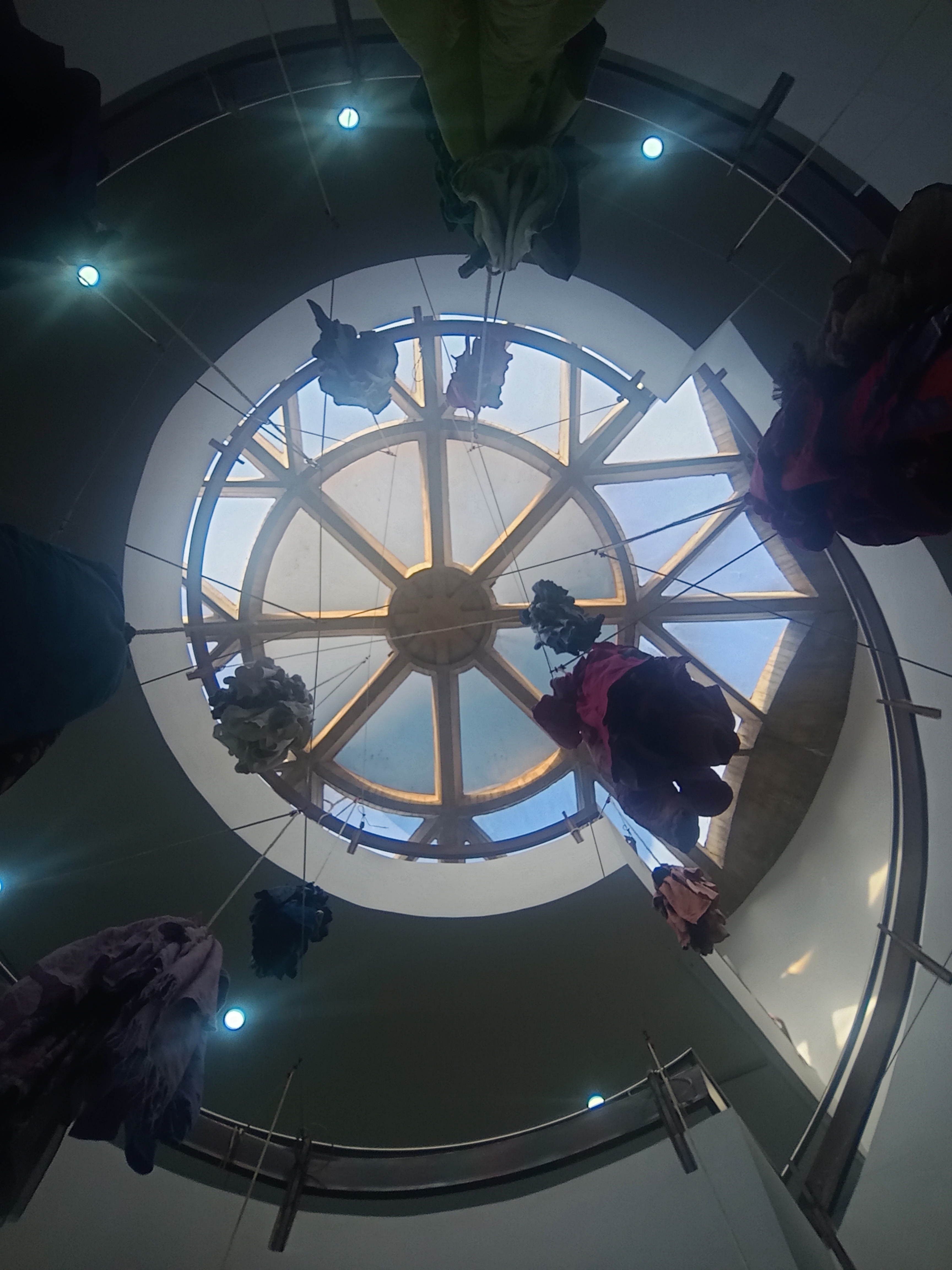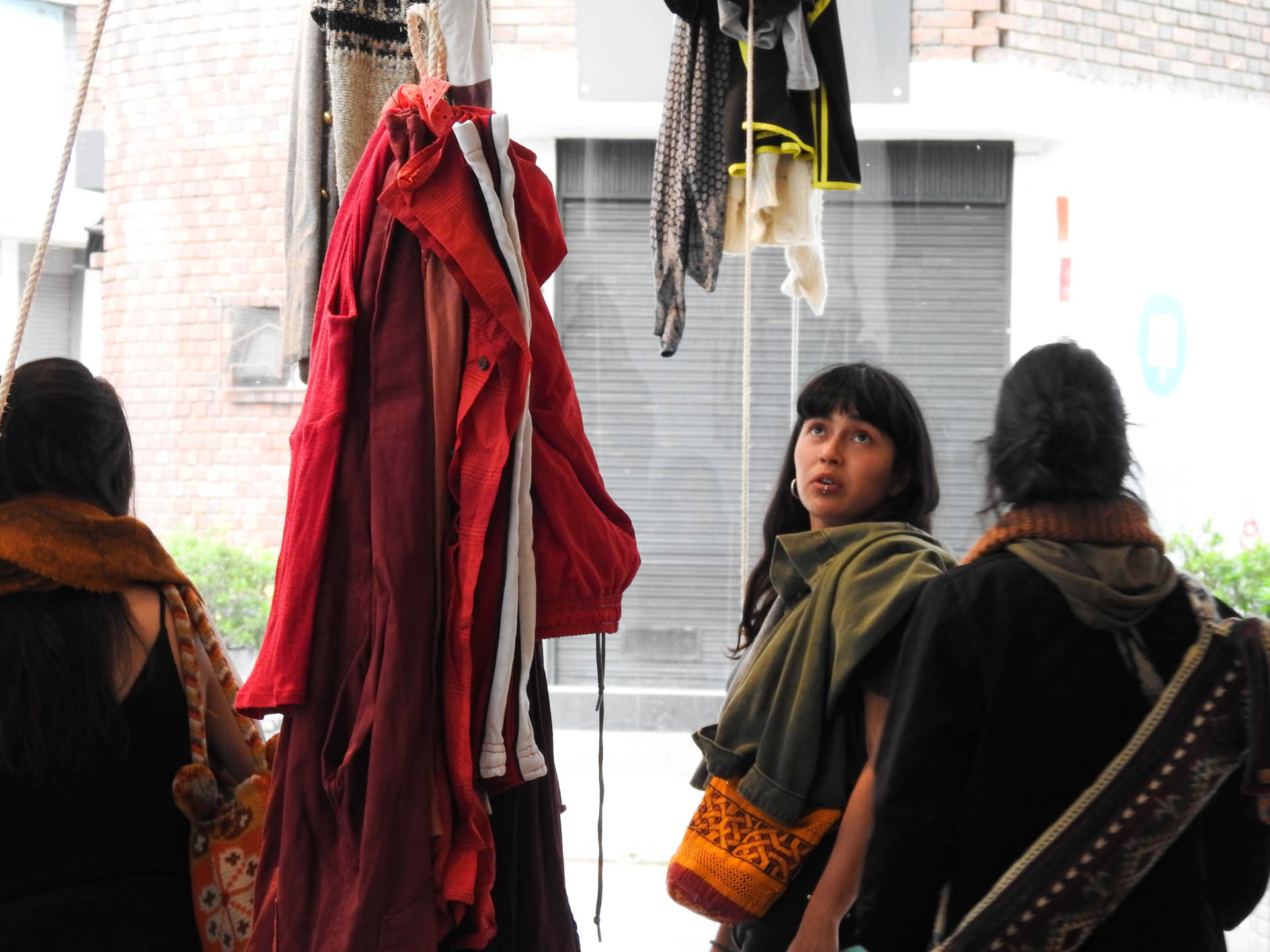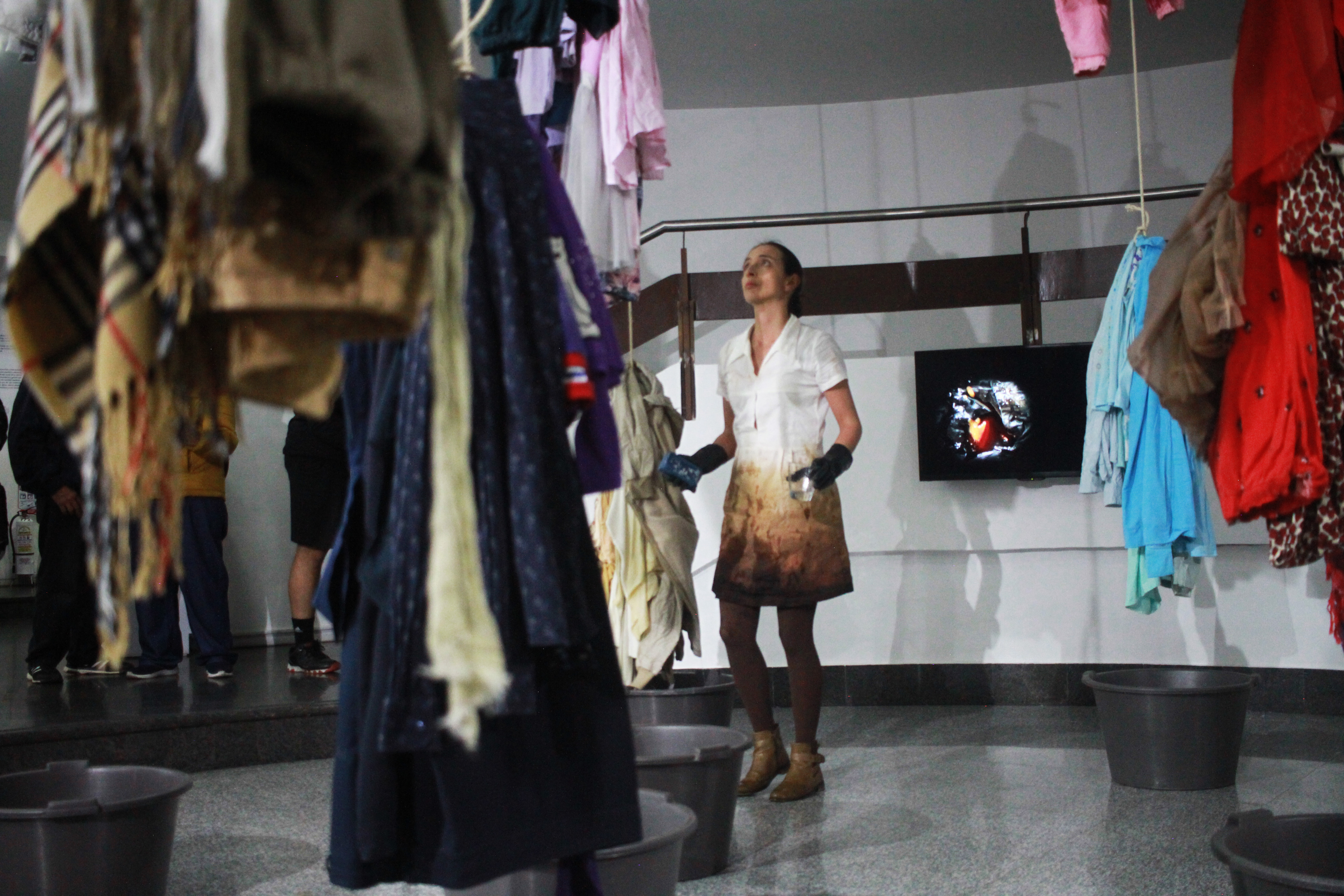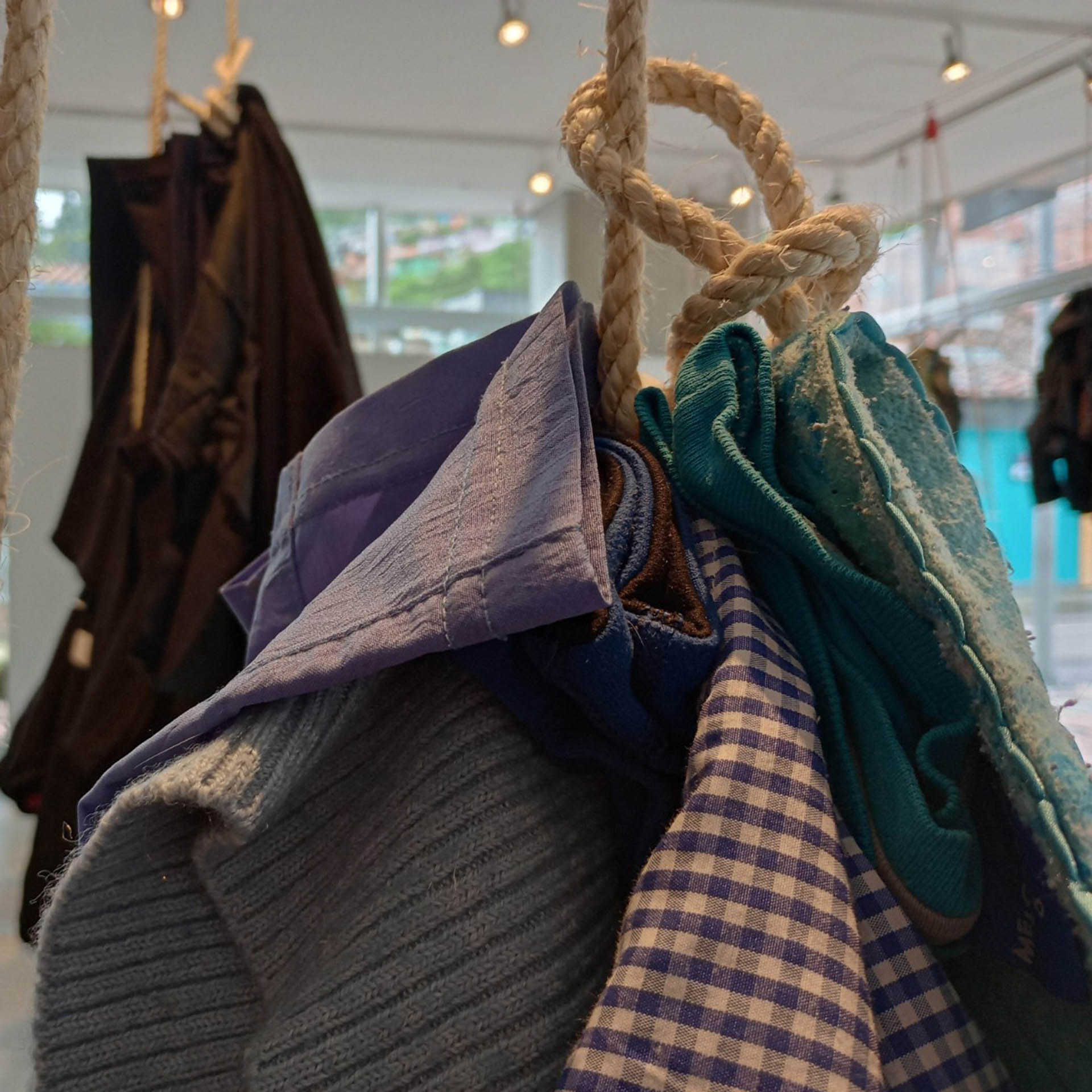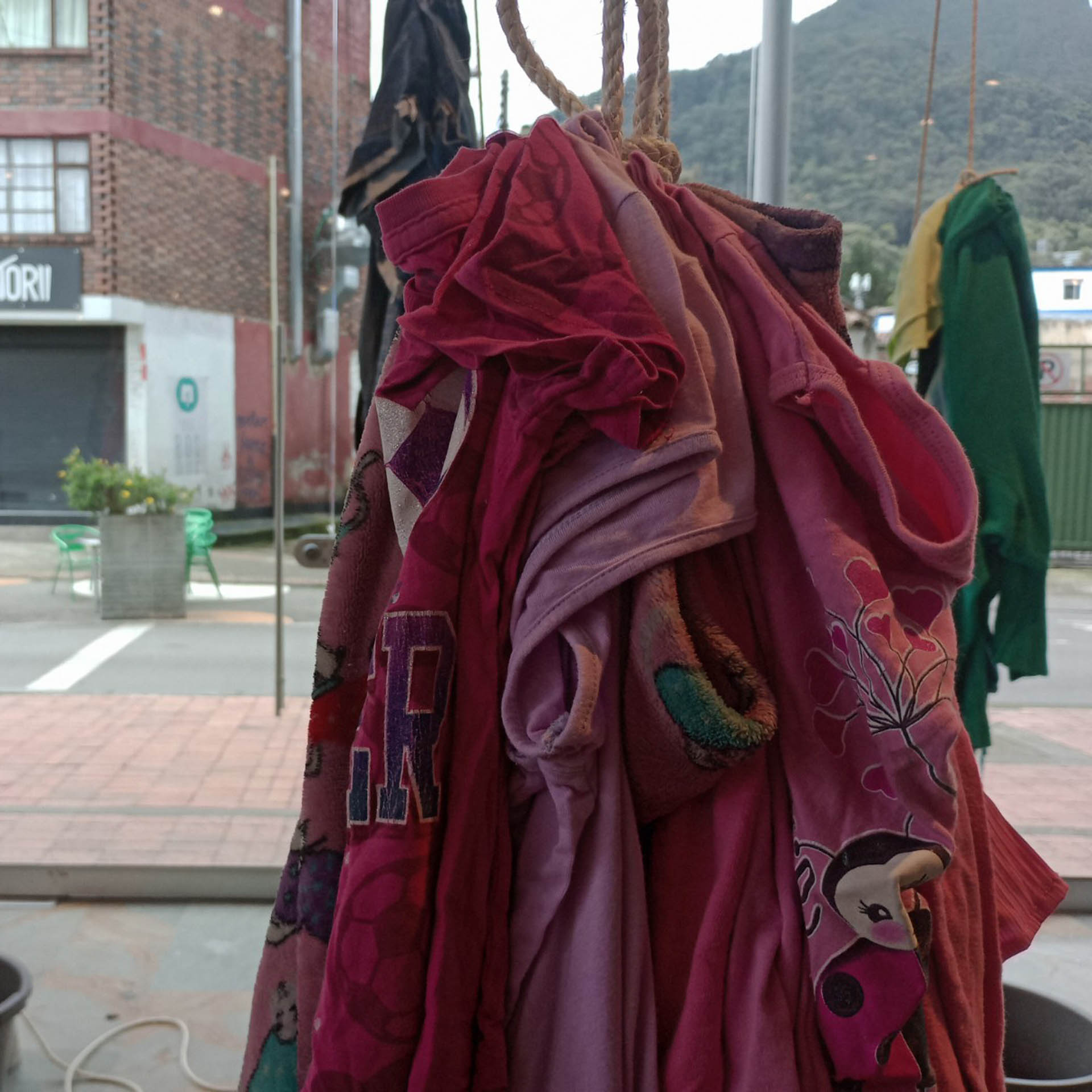 25 cúmulos de ropa / 25 baldes plásticos con agua y jabón / 25 poleas, cabuya y pesos de cemento / video en pantalla 7:43:00 minutos, reproducido en loop.